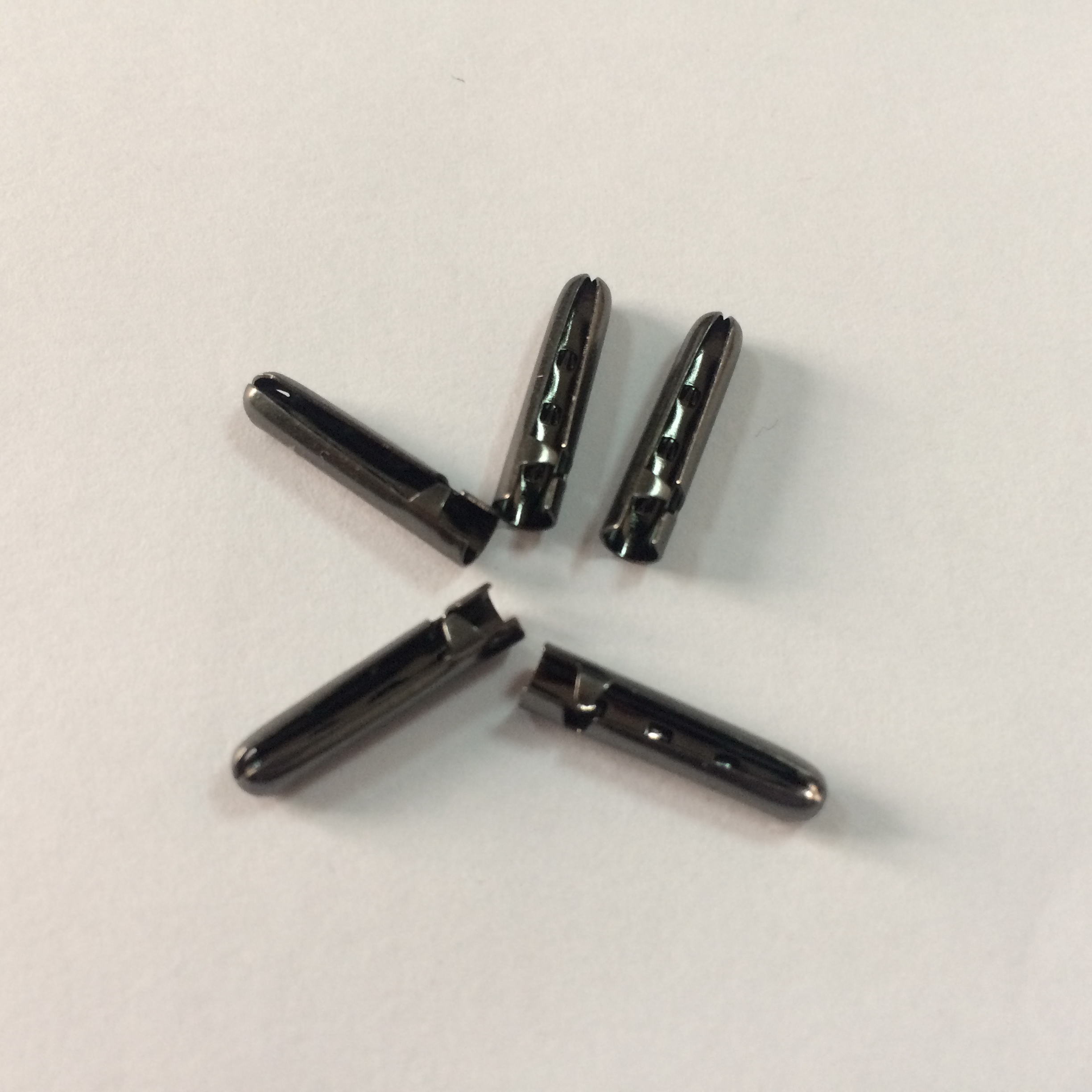 The traditional acetate film used on tipping machine,but when cut the film need the acetone as glue material, so it is not environmental. Due to many government buyers’ request, our factory start to produce the metal tips. Our metal tips used copper to mould and approved OEKO-TEX 100 standard certificate. The U type metal shoelace tips mainly used on shoelace, the color can be coated according to customer’s request. If our customers request us to carve their Logo on the tips, we also do it.
