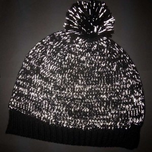 1. Reflective thread being knitted, crocheted or weaved along with another yarn for added strength.